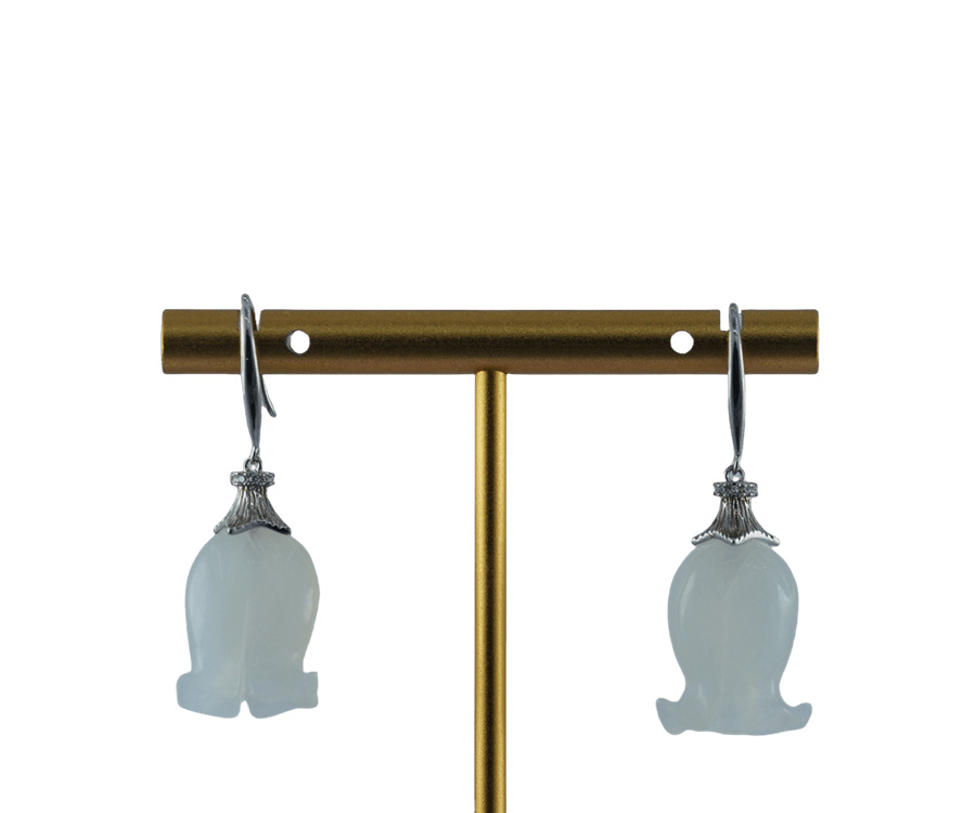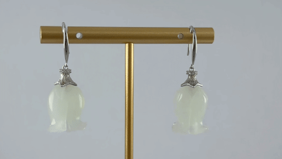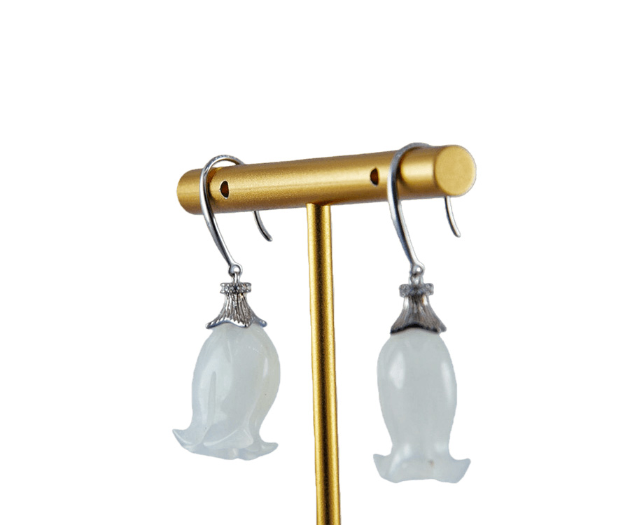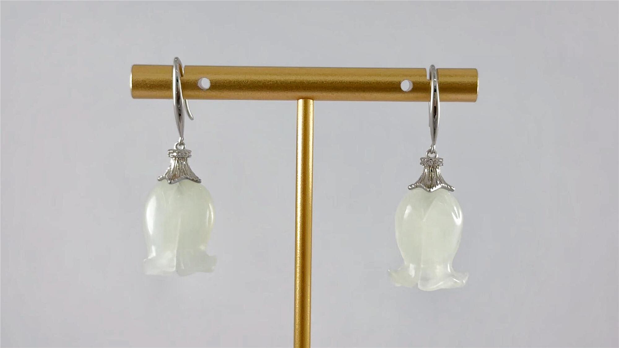 1. 耳钉采用S925银打造,亲肤不易过敏。顶端是一圈镶嵌着小水钻锆石的花环,匠人精心攥刻一朵四瓣精巧的小花瓣的“伞帽”,采用传统纂刻与花丝技法,制作出细腻精致的金属纹理,赋予作品灵动的层次感与呼吸感。下面那颗垂坠而下的天然玉石。匠人全手工将其雕刻成铃兰花的形态,含苞待放,温润如玉,色泽莹透。它随着你的步伐轻轻摇曳,不张扬,却自有一番清冷又温柔的气韵。