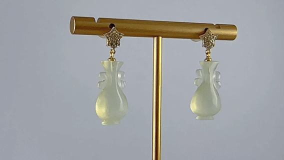1. 耳钉采用925纯银,佩戴舒适,不过敏。五角星形表面采用微镶工艺,紧密排列满镶多颗高亮度水钻锆石,火彩璀璨,不易脱落 。下挂部分选用天然玉石,经由工匠全手工雕刻成如意瓶造型。玉石天然的色泽与纹理独一无二,瓶身线条细腻流畅。上部金属的闪耀华丽与下部玉石的温润内敛形成材质与光泽的对比。密镶的水钻锆石保证了在光源下的高折射率,而下端的玉石则带来沉静的高级质感,一动一静,层次丰富。