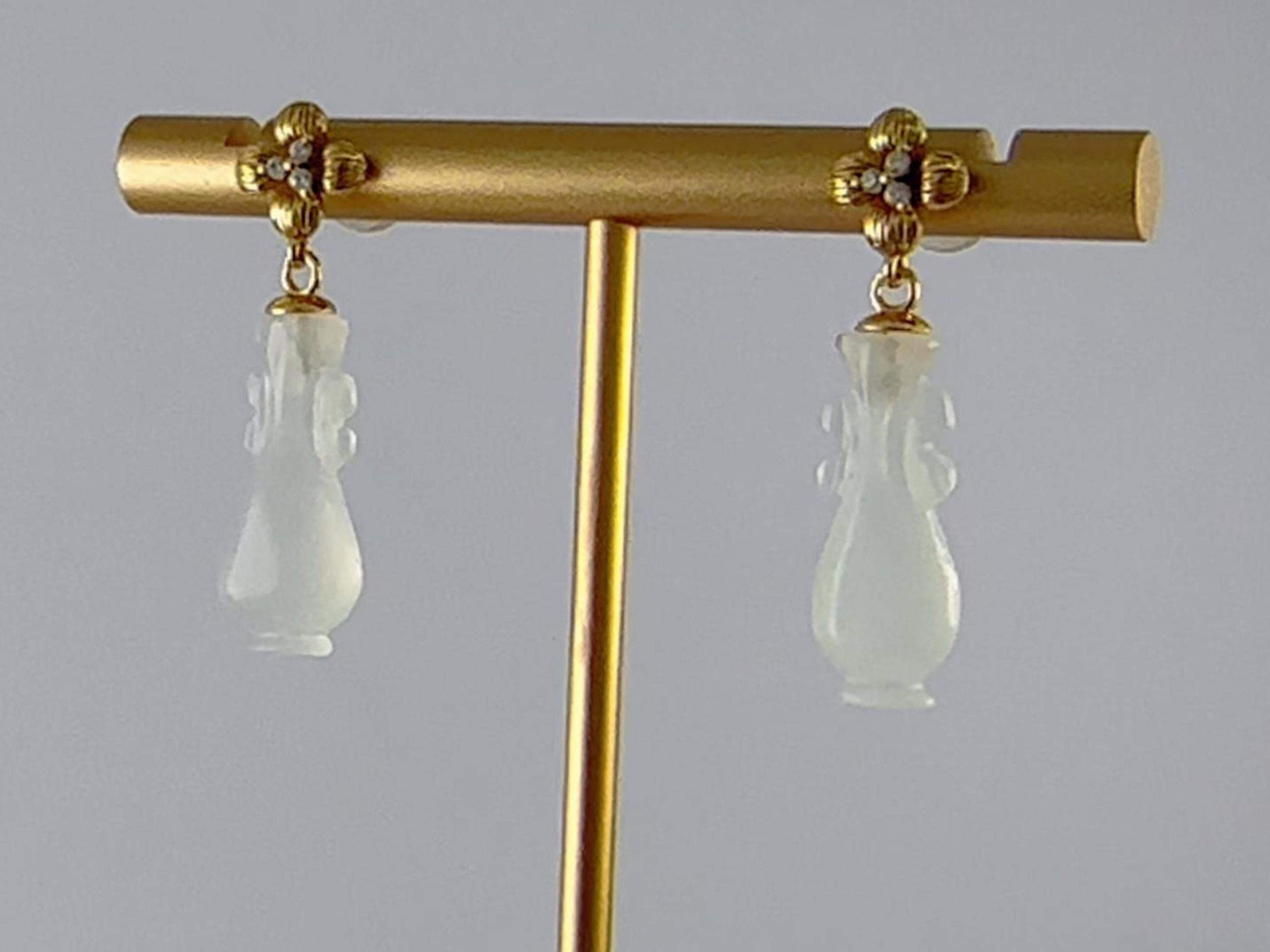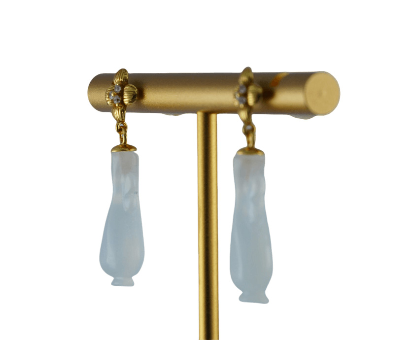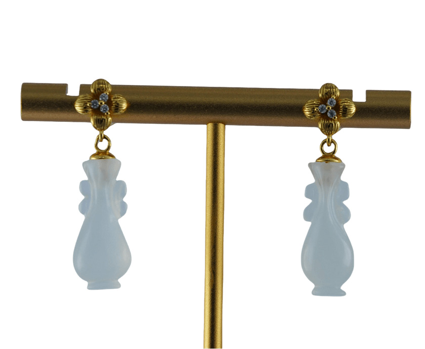 1. 耳钉用925银纂刻立体的花瓣。每一片都饱满舒展,保持着盛放的姿态。在花心深处,镶嵌着3颗璀璨的小水钻锆石,折射出细碎的光芒。下面连接的是天然玉石手工雕刻的如意瓶。天然的纹理温润如水。线条流畅。上端是写实的立体银花,下端是写意的玉石如意瓶,一实一虚,一刚一柔,形成绝妙的视觉平衡。花心的水钻成为连接二者的光点,让整件作品充满层次感和故事性。