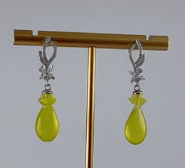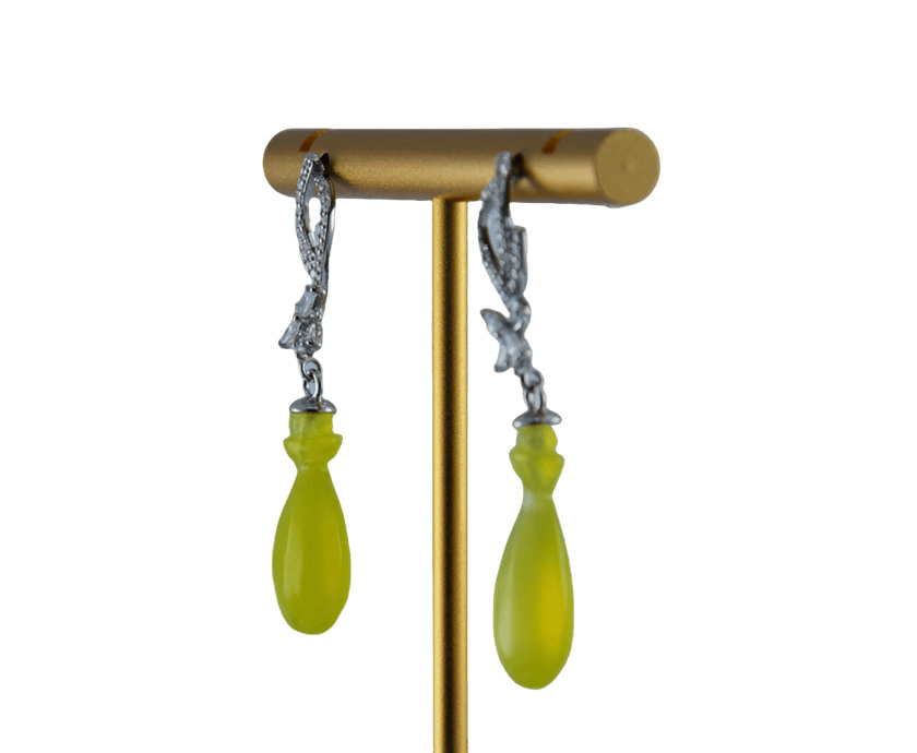 1. 耳钉用925银条勾落出花苞的形状,上面密镶嵌璀璨的小水钻锆石。下部与四颗水钻组成的四瓣花相连,每颗水钻都单独镶嵌,折射出耀眼的光芒。下面连接的是天然玉石手工雕刻的平安瓶。天然的纹理温润如水。线条流畅优雅。上端是写实的立体银花,下端是写意的玉石平安瓶,一实一虚,一刚一柔,形成绝妙的视觉平衡。四瓣花的水钻成为连接二者的光点,让整件作品充满层次感和故事性。