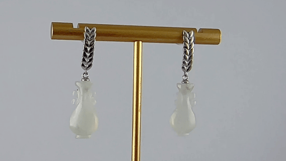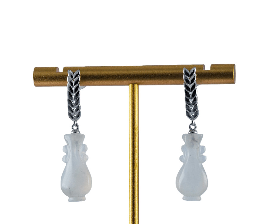 1. 耳钉采用925银手工纂刻出立体的麦穗造型。匠人以细腻的刀法还原麦穗的自然形态——颗粒饱满,芒尖微扬。下方连接手工雕刻的天然玉石如意瓶,清透温润,如水珠将落未落,恰好停驻在麦穗之侧。麦穗象征丰收与富足;如意瓶则代表幸福如意的愿望。佩戴这对耳钉,是将“丰衣足食”与“生生不息”的美好祝福融入日常,亦是献给热爱生活之人的温柔礼赞。