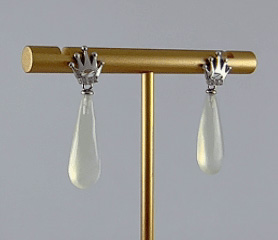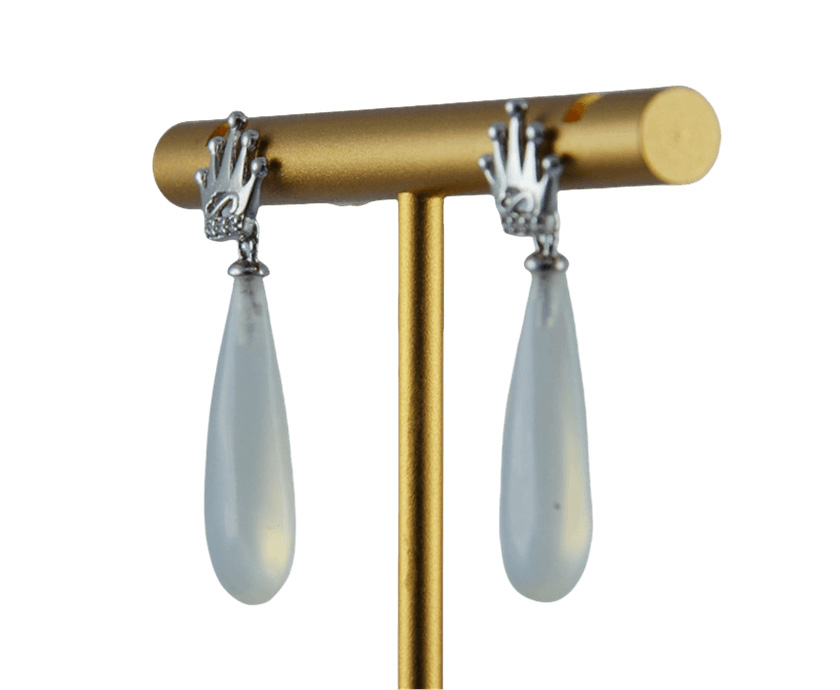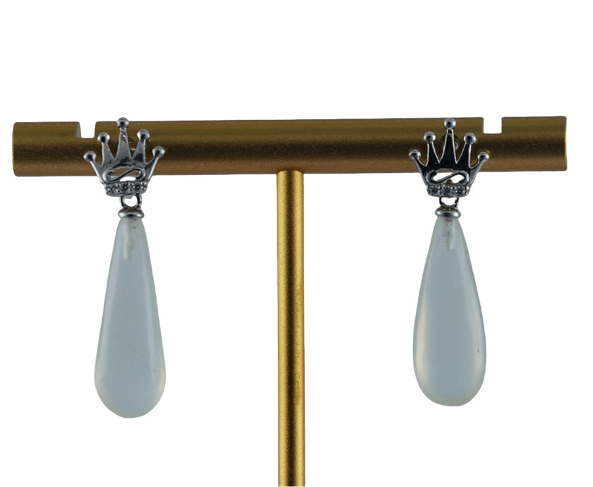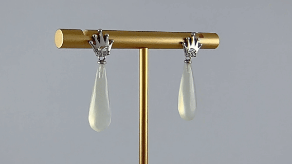 1. 耳钉以925银为基底,手工纂刻成皇冠形态。下面连接的是天然玉石手工立体雕刻成细长水滴造型。线条柔美,层次分明。匠人通过深浅不一的刀法,赋予玉石灵动的生命力,都独一无二,不可复制。作品将古典皇冠的古朴与水滴的清雅巧妙融合,通过银质冷冽与天然玉石的内敛形成质感碰撞,既有轻奢品的精致感,又有日常佩戴的百搭性。