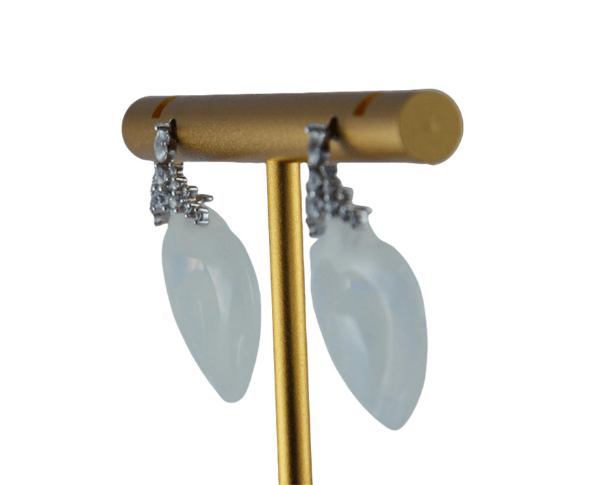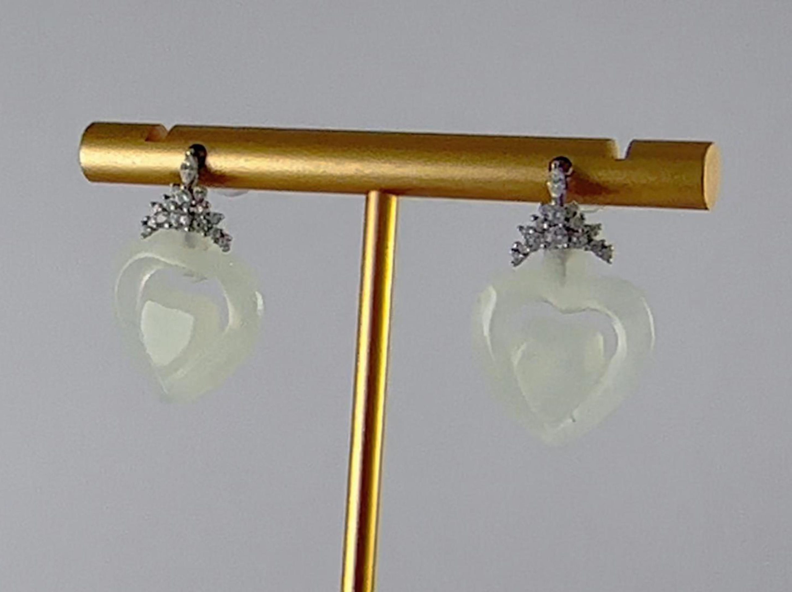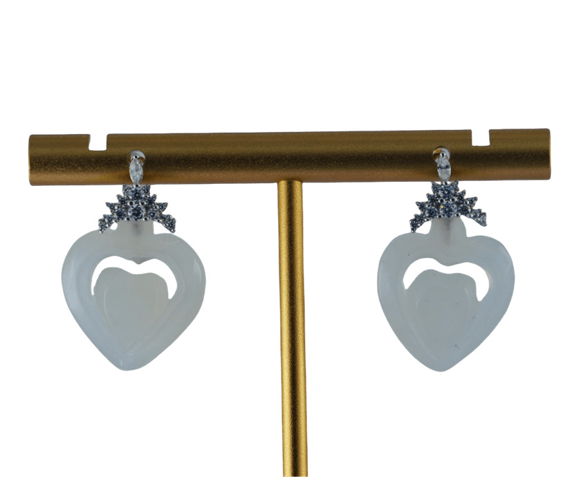 1. 耳钉以925银为基底,璀璨的水钻锆石镶嵌成皇冠形,光芒四射。皇冠底部是一道流畅的弧形与下面垂坠自然衔接,纯手工立体雕刻成桃心造型。线条柔美,层次分明。匠人通过深浅不一的刀法,赋予玉石灵动的生命力。作品将古典花冠的华美与桃心的清雅巧妙融合,通过满钻镶嵌的闪耀与天然玉石的内敛形成质感碰撞,既有轻奢品的精致感,又有日常佩戴的百搭性。