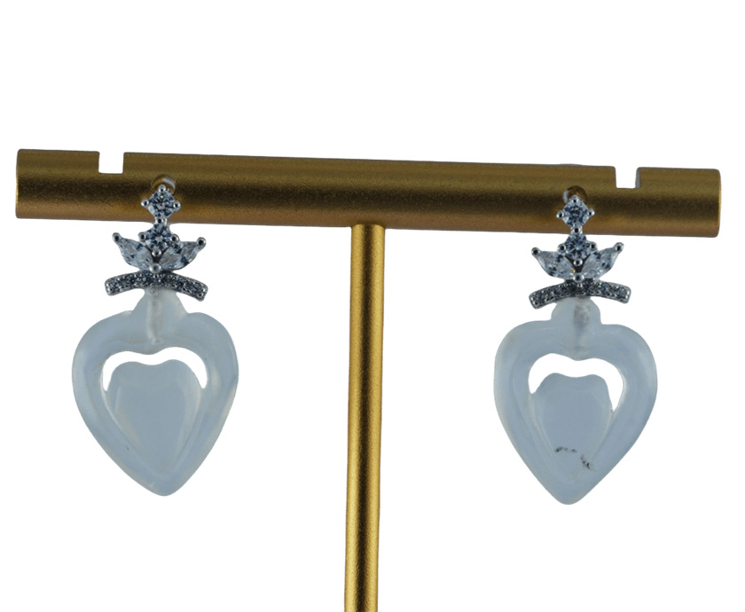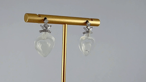 1. 耳钉以925银为基底,四颗璀璨的水钻锆石镶嵌成皇冠形,光芒四射。皇冠底部是一道流畅的弧形与下面垂坠自然衔接,纯手工立体雕刻成桃心造型。线条柔美,层次分明。匠人通过深浅不一的刀法,赋予玉石灵动的生命力。作品将古典花冠的华美与桃心的清雅巧妙融合,通过满钻镶嵌的闪耀与天然玉石的内敛形成质感碰撞,既有轻奢品的精致感,又有日常佩戴的百搭性。