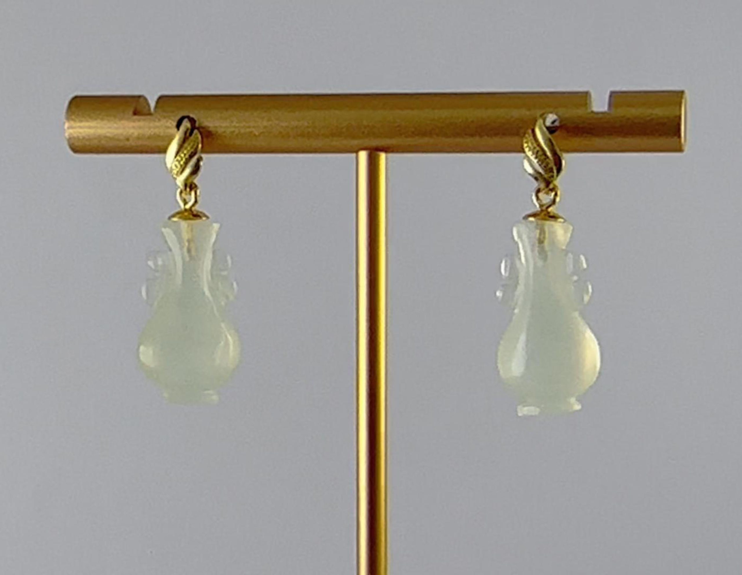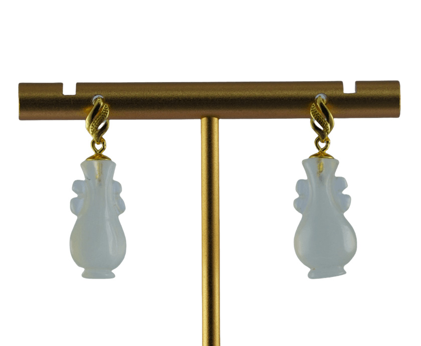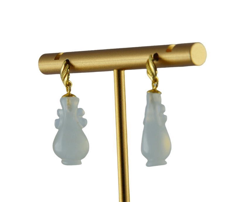 1. 耳钉主体以925银手工打磨成飘带形状,表面经抛光呈现柔和的金属光泽。飘带中间采用古法攥刻小点,使飘带更有层次感。下方是纯手工立体雕刻成如意瓶造型。线条柔美,层次分明。匠人通过深浅不一的刀法,赋予玉石灵动的生命力,每个都独一无二,不可复制。