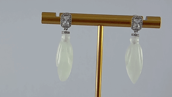 1. 耳钉是一颗璀璨夺目的长方形切割主水钻锆石,在它的四周,以精工密镶一圈细密小水钻锆石。大小水钻交相辉映,主次分明,在方寸之间构筑出既有建筑结构感又不失璀璨华丽的视觉焦点。水钻下是一枚天然玉石手工雕刻而成的大玉兰花。玉石温润的质感,是任何人工材料都无法复制的生机。匠人依据玉料的原生形态与色泽,磨砺出饱满、线条流畅得仿佛下一秒就要滑落。