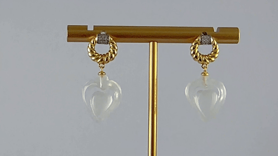 1. 耳环设计从一根绳圈开始。匠人以925银纯手工打造出圆润的绳结造型,银丝缠绕成环,首尾相连处,密密镶嵌着满圈小水钻锆石。绳圈之下,垂坠着一枚由天然玉石手工雕刻而成的桃心。玉的温润被匠人细细雕琢成饱满的心形,不张扬、不炫目,却自有一种沉静的力量。当银绳的璀璨遇见玉心的温婉,恰如热烈的心意终于找到安放的归处——绳结系住了缘分,桃心装满了深情。愿这一圈银绳,圈住你所有的美好际遇;愿这一枚玉心,替你珍藏每一次心动。