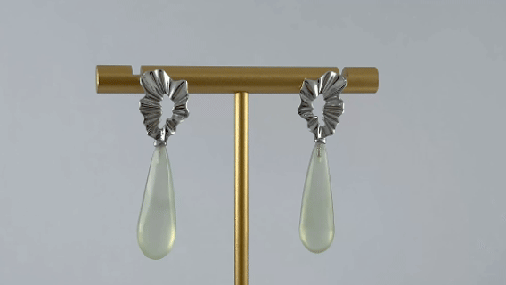 1. 耳钉主体由925纯银打造出一枚不规则圆形环扣,在其表面雕琢出无数坑洼不平的微小凹陷。银环之下,天然细长水滴温润垂落。匠人精选玉料,顺应其天然纹路与色泽,手工雕琢出细长水滴优雅的曲线。玉质的温润光泽与银环的粗粝质感形成诗意对比——一个是被自然温柔包裹的珍宝,一个是经历风霜依然坚韧的见证。