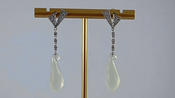 1. 这款耳钉以925银托为基底,两个三角形上密镶小水钻锆石。下方三粒水钻与其遥相呼应。其间以纤巧的银环灵动相连,形成一条会随着步伐轻轻摇曳的“光之链条”。所有光华最终温柔地导向终点——一枚由天然玉石手工雕刻而成的玉兰花。匠人顺应玉石的天然肌理与色泽,将玉石打磨得圆润饱满,触手生温。玉质的柔光与钻石的锐彩在此交融,坚硬的矿石被赋予了最柔软的形态,恰似一份由光芒护送、最终归于温润的深情告白。