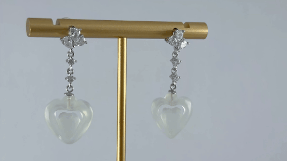 1. 这款耳钉,三颗水钻以精准的间距镶嵌于925银托之上。下方两粒水钻与其遥相呼应。其间以纤巧的银环灵动相连,形成一条会随着步伐轻轻摇曳的“光之链条”。所有光华最终温柔地导向终点——一枚由天然玉石手工雕刻而成的桃心。匠人顺应玉石的天然肌理与色泽,将心形打磨得圆润饱满,触手生温。玉质的柔光与钻石的锐彩在此交融,坚硬的矿石被赋予了最柔软的形态,恰似一份由光芒护送、最终归于温润的深情告白。