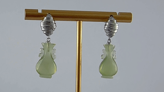 1. 此款925银线锤形耳钉,呈现出优雅的弧度与尖锐的末端。佩戴时,以鲜明的几何形态和流动的金属光泽,瞬间抓住视线,展现不拖泥带水的个性宣言。下面是一枚天然玉石的如意瓶。每一枚玉瓶均由匠人亲手雕琢,充分利用玉料的天然色泽与纹理。玉瓶玲珑小巧,造型经典,寓意将一切美好与平安收纳其中。当步履移动,玉瓶随之轻轻晃动,温润的玉光与上方银锥的锐利银辉交织碰撞,静中有动,冷中带暖,充满了生动的趣味与深长的韵味。