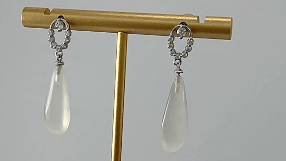 1. 主体以925银丝,弯绕成一道圆圈。银圈之上,精心镶嵌着一排璀璨夺目的细小水钻。银圈之下,悬垂一滴天然玉石手工雕刻而成的细长水滴。玉石温润的质感与淡雅色泽,与上方银钻的清冷璀璨形成温柔对比。每一滴细长水滴都独一无二,蕴含天然纹理,造型圆润饱满,线条流畅,象征着纯净、柔韧与永恒不息的生命力。它随着步履轻盈摇曳,动静之间,尽显东方婉约与现代简约的融合之美。