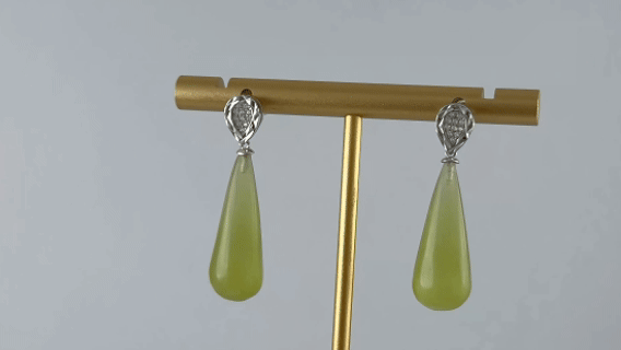 1. 这款耳钉以925银为骨,水滴边缘一圈精致的手工錾刻凹痕,以精妙的密镶工艺,将小水钻锆石满布于水滴的中心。下面一枚天然玉石手工雕刻的锥形水滴轻盈垂落。玉石温润的质地与柔和光泽,与上方水钻锆石的绚烂形成了动人的对话。水滴造型圆融古朴,线条流畅。钻石的闪耀是向外的表达,而玉质的温润是向内的沉淀。一上一下,一显一藏,诉说着:即使外表如钻石般耀眼坚强,内心总有一处如玉般安稳妥帖,珍藏着最朴素的平安祝愿。