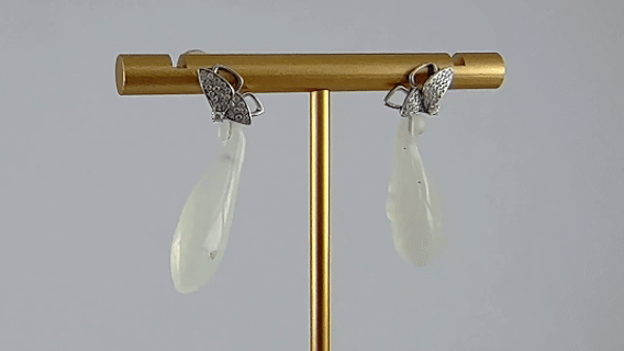 1. S925纯银被抽捻成细的丝线,在匠人的指尖缠绕、勾勒,幻化成一只展翅欲飞的蝴蝶。它并非停驻,而是定格在振翅的刹那,姿态灵动。蝶翼之上,密镶的璀璨小钻。蝶所眷恋的,是那一朵垂悬的、由天然玉石手工雕琢的玉兰。玉质温润如凝脂,色泽清雅,匠人以刀代笔,琢出花瓣层叠的饱满与尖端那一点欲放的羞怯。玉兰静静绽放于耳畔,无需香气,其温婉气质已盈然而生。银蝶的灵动璀璨与玉兰的静雅润泽,一上一下,一动一静,恰似一个精妙的寓言——是蝶恋花,亦是花引蝶,演绎着耳畔永恒的春日叙事。