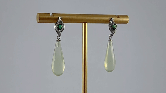 1. S925银塑造的花苞,以抽象而饱满的曲面构成,摒弃繁复,只留取植物初生时最具力量感的形态。苞心镶嵌的绿色大水钻锆石,花瓣上密镶小水钻锆石。下方的水滴,是设计中最具人文温度的转折。天然玉石经过精密切割与手工打磨,呈现为简约、流畅的瓶形轮廓。我们着重展现玉石本身的天然肌理与温润光泽,将其化为一种“温暖的重量”。寓意将纷扰净化,将福祉收纳,是极具现代感的护身符。