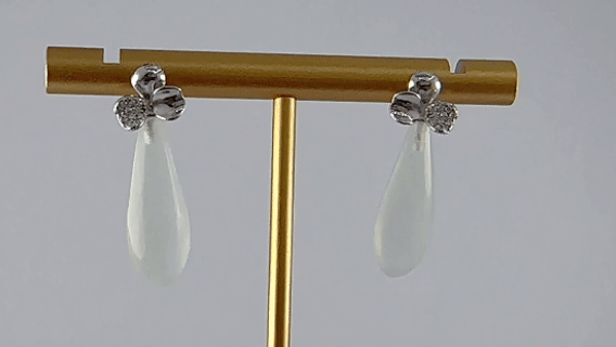 1. S925纯银雕琢的三瓣花,正值含苞待放的时刻。其中一个花瓣密镶璀璨小水钻锆石。下面垂悬一朵天然玉石雕刻的水滴。玉石特有的柔光与润泽,中和了金属的锐利,增添一份大自然的呼吸感。水滴的手工雕痕清晰可见,那是匠人与材料之间的温柔对话。每一次佩戴,都是与古老文明的温柔触碰,亦是现代女性刚柔并济的优雅宣言。