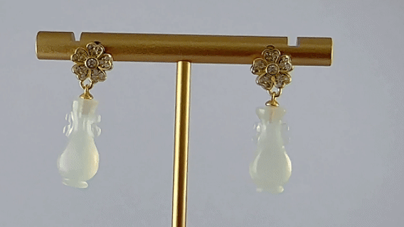 1. 耳钉顶部是一朵手工攥刻的925银丝花。每一片花瓣都以纤细的925银丝精心弯折而成,花瓣中心密镶嵌璀璨小水钻锆石;下面是一个天然玉石手工雕刻的如意瓶盈盈垂落。玉质温润,造型圆融,匠人以简练刀法保留玉石天然的肌理与光泽。它不争不抢,只静静悬于璀璨花光的尽头,如一句温柔的收尾。