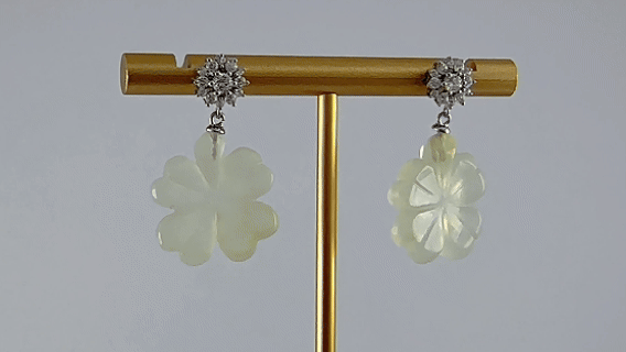 1. S925银锻造的花朵形态高度抽象,去除一切繁复细节,只保留“盛开”这一纯粹意象。花瓣与花心满镶的水钻锆石,构成连续的光之表面,不模拟自然,而是将光芒本身作为材质进行铺陈。这是一朵由纯粹光芒凝结而成的几何之花。天然玉石,手工雕刻。叶柄纤细,叶面圆润。刀法简净,不留多余痕迹,只在叶脉处轻轻一道,像是风刚刚路过。它们在一起,像把一句古老的祝福,开成了耳畔具体的形状。