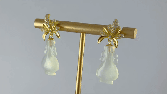 1. 这款极具设计感的轻奢国风耳饰。设计师以925银为基底,匠心勾勒出枫叶的五角轮廓。巧思之处在采用左右不对称的叶片造型,通过密镶闪钻锆石与磨砂哑光两种截然不同的表面处理工艺形成强烈视觉对比,下方坠以手工雕刻的天然玉石如意瓶。这对耳钉动静皆宜。磨砂枫叶的哑光质感衬托东方女性的温婉内敛,密镶枫叶的闪耀则在不经意间流露时尚品味。