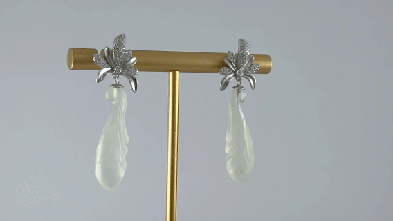 1. 这款极具设计感的轻奢国风耳饰。设计师以925银为基底,匠心勾勒出枫叶的五角轮廓。巧思之处在采用左右不对称的叶片造型,通过密镶闪钻锆石与磨砂哑光两种截然不同的表面处理工艺形成强烈视觉对比,下方坠以手工雕刻的天然玉石玉兰花。这对耳钉动静皆宜。磨砂枫叶的哑光质感衬托东方女性的温婉内敛,密镶枫叶的闪耀则在不经意间流露时尚品味。