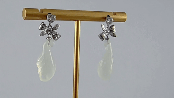 1. 耳钉最上方是一颗璀璨的心形大水钻锆石,边缘密密镶嵌着无数小水钻,往下看,是一个用925银纯手工錾刻的丝巾结。匠人以刻刀在银质表面细细雕琢,打造出丝巾特有的柔韧褶皱感与编织纹理。下面精选天然优质玉石,全手工立体雕刻成饱满玉兰花。它温润内敛,不事张扬,却最是耐看。那是历经岁月沉淀后,依然不变的初心。