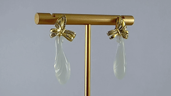 1. 耳钉用925银纯手工錾刻的丝巾结,不对称造型,间隔丝巾上满镶小钻石,和在银质表面细细雕琢,打造出丝巾特有的柔韧质感。下面精选天然优质玉石,全手工立体雕刻成饱满玉兰花。它温润内敛,不事张扬,却最是耐看。那是历经岁月沉淀后,依然不变的初心。