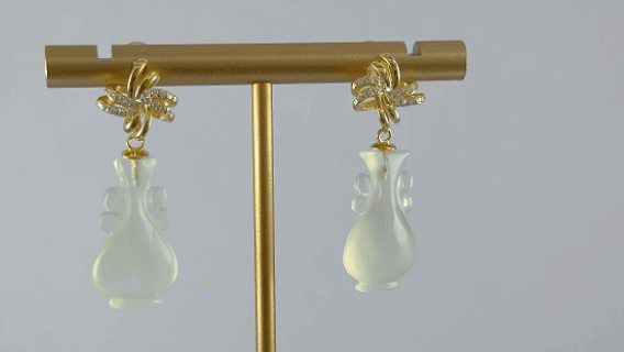 1. 设计师将传统中国结的“盘扣”元素进行现代化演绎,用925银以双股丝带的柔美曲线勾勒出耳畔的灵动感。对向而行的丝带上密镶高光泽度微镶水钻,璀璨如星河,瞬间提亮肤色。下面精选优质天然玉石,手工雕刻成立体如意瓶造型 。玉石质地细腻,色泽温润饱满,晶体内部有自然的棉絮或纹路,这是天然产物的独特身份证 。造型饱满圆润,寓意平安如意。