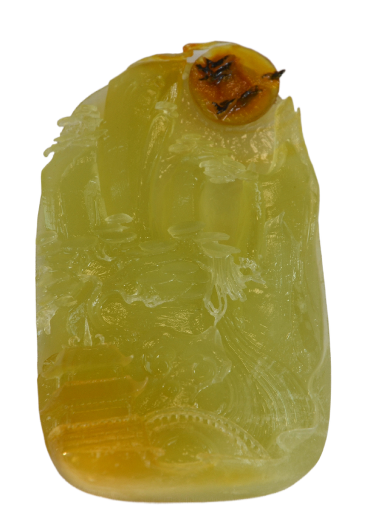 作品:这是一件集圆雕、镂空雕、悬空雕于一体的微型立体山水画卷。从近景到远景,从上到下,构筑出完整的视觉叙事:在红太阳上俏色巧雕几只黑色孤鹜一起在飞翔,晚霞浸染下的楼阁和群山,白色瀑布自上而下,晶莹剔透的松树自下而上,秋水长天,天水相接,浑然一体,远近、上下、立体式的展现出一幅深秋江山图。玉石虽小,却承载了“江山万里入怀来”的文人胸襟,是对古典山水诗意的立体转译。