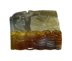 B. 红色屋顶:红色玉脉被精准雕琢为瓦片屋顶,层层叠叠,错落有致。瓦片以阴刻线勾勒,线条流畅,疏密有致。这一抹红位于作品顶部,在浅灰底色的衬托下,如同夕阳余晖洒在屋顶,温暖而醒目,寓意“红运当头”。